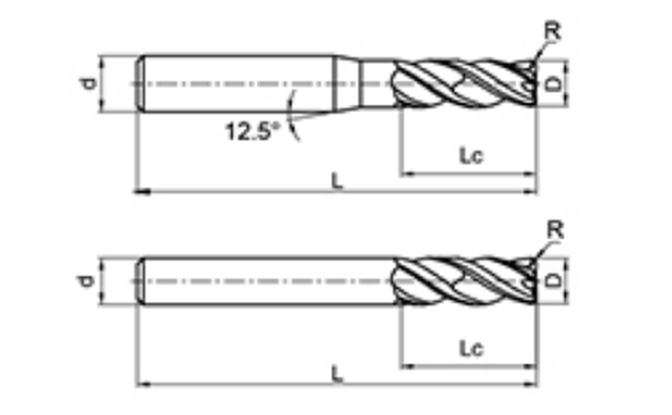 | Nu. | Diametrul D | Unghiul R R | Lungimea flautului Lc | Lungimea totală L | Diametrul tijei d | Număr de lame F |