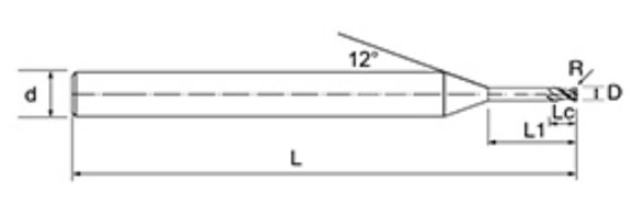 | Nu. | Diametrul D | Unghiul R R | Lungimea flautului Lc | Lungimea efectivă L1 | Lungimea totală L | Diametrul tijei d | Număr de lame F |