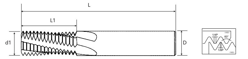 | Pitch | Dinții grosieri UNC | Dinți Fini UNF | Dinți ultrafine UNEF | Diametrul lamei d1 | Lungimea efectivă a lamei L1 | Diametrul mânerului D | Lungimea totală L | Număr de lame | Diametrul găurii inferioare |