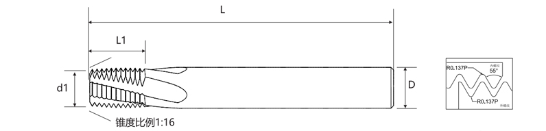 Această freză este potrivită pentru o varietate de materiale, inclusiv oțel carbon, oțel aliat, oțel inoxidabil, fontă, metale neferoase și materiale plastice. Disponibil în mai multe specificații, de la RC1/16 până la 2", oferă flexibilitate pentru a se potrivi diverselor cerințe de aplicație. Designul sculei permite configurații adaptabile de parametri, inclusiv diametrul de tăiere d1, lungimea efectivă de tăiere L1, diametrul tijei D și lungimea totală L, optimizând eficiența prelucrarii și calitatea filetului.